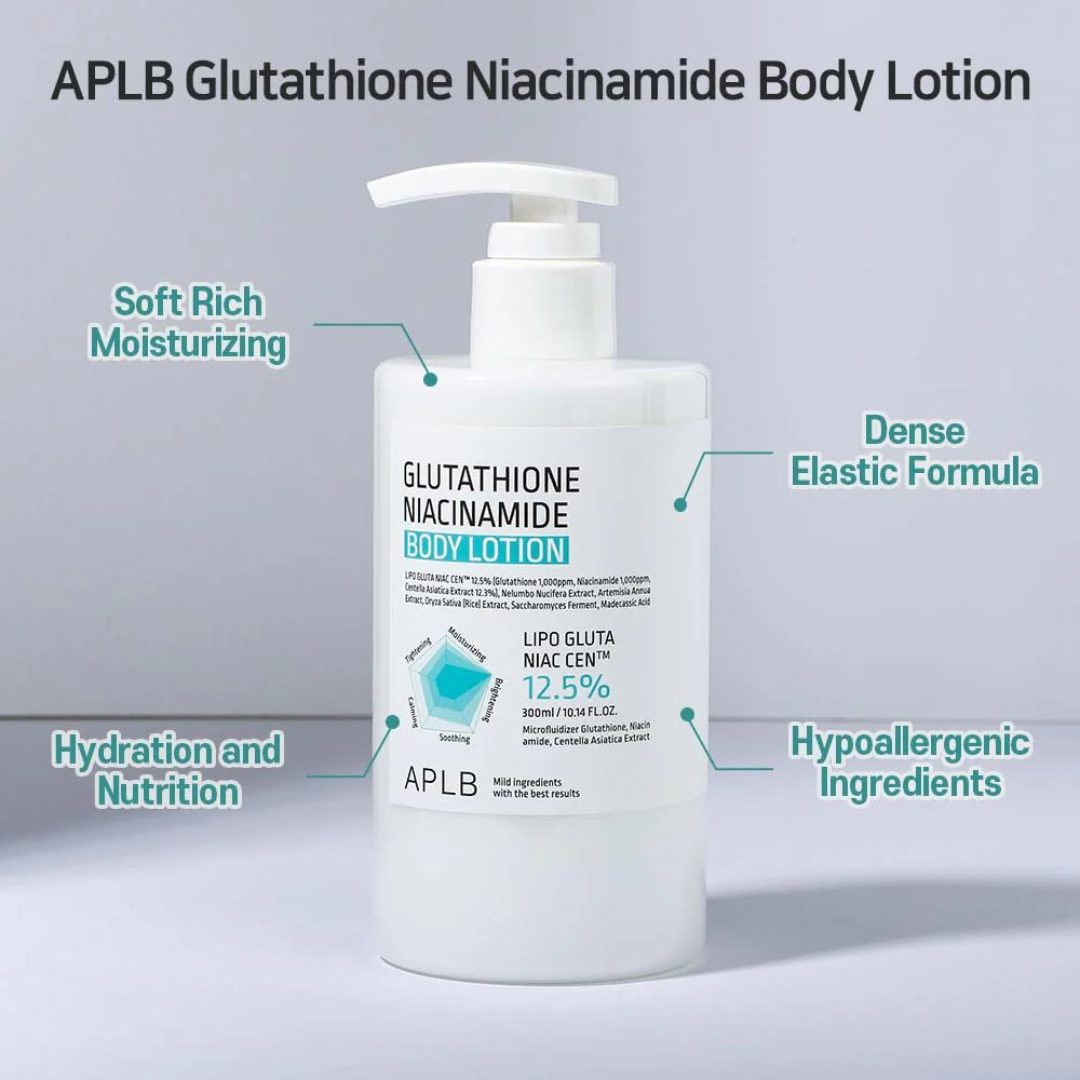 La Glutathione Niacinamide Body Lotion de APLB es una loción corporal de tratamiento diseñada para hidratar la piel mientras trabaja progresivamente el tono desigual, la opacidad y la textura irregular. Su fórmula combina glutatión y niacinamida, dos activos reconocidos por ayudar a mejorar la luminosidad y uniformidad del tono, junto con agentes humectantes que mantienen la piel confortable durante todo el día.