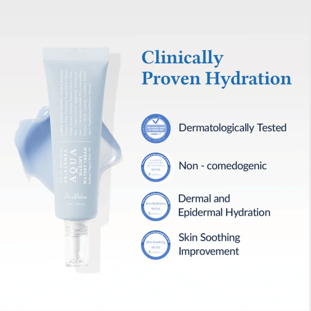 La Aqua Marine Watery Cream de Dr. Althea es una crema hidratante de textura gel-crema acuosa diseñada para aportar hidratación intensa y duradera sin obstruir poros. Su fórmula rica en minerales marinos, ácido hialurónico y activos calmantes ayuda a restaurar el equilibrio de la piel, mejorar la elasticidad y mantener una sensación fresca y confortable durante todo el día.
