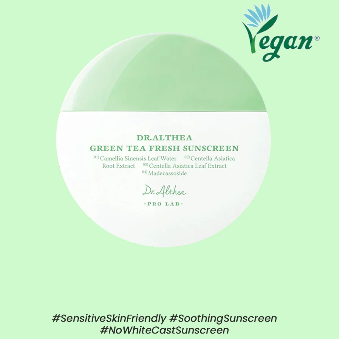 El Green Tea Fresh Sunscreen de Dr. Althea es un fotoprotector de textura ligera tipo crema-gel que combina protección solar de amplio espectro con beneficios calmantes y antioxidantes. Su fórmula, centrada en el extracto de té verde, protege la piel de los rayos UV mientras ayuda a reducir el estrés oxidativo, controlar el exceso de sebo y mantener la hidratación.