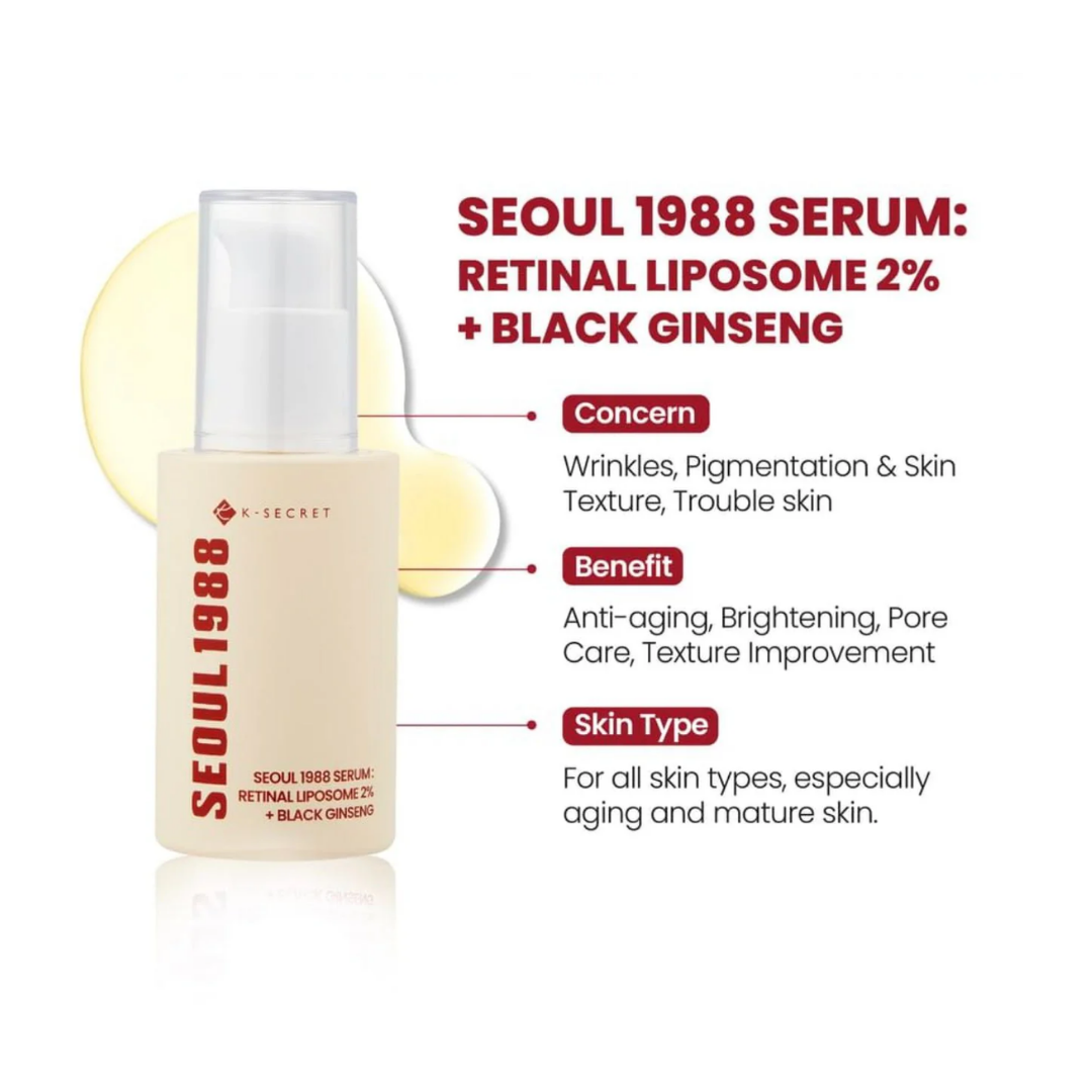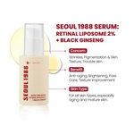 Un suero antiedad de alta eficacia diseñado para combatir arrugas, mejorar elasticidad y unificar el tono de la piel. Su tecnología encapsula el retinal liposomado al 2%, que renueva intensamente sin causar irritación. Además, el extracto de ginseng negro al 58% potencia la firmeza, protege con antioxidantes y calma inflamaciones. Con niacinamida, bakuchiol, vitamina C y péptidos, ofrece un tratamiento global para una piel visiblemente más joven y radiante. Libre de fragancia.
